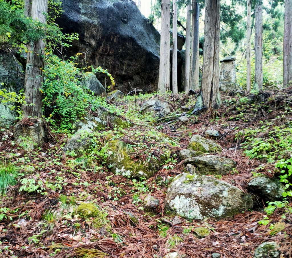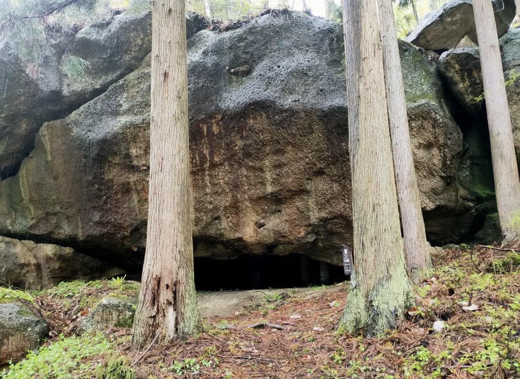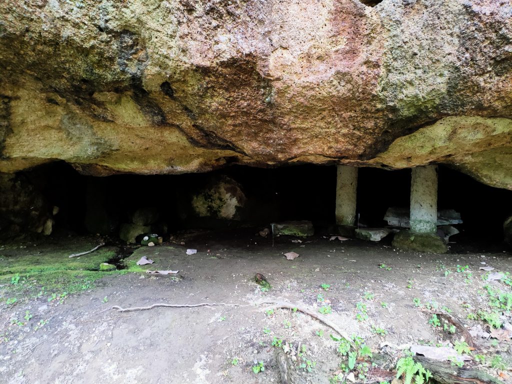 There are large rocks stacked on top of each other, and there is enough space underneath to bend down and enter. The cave is covered with sediment, but it is believed to have been much larger in the past.