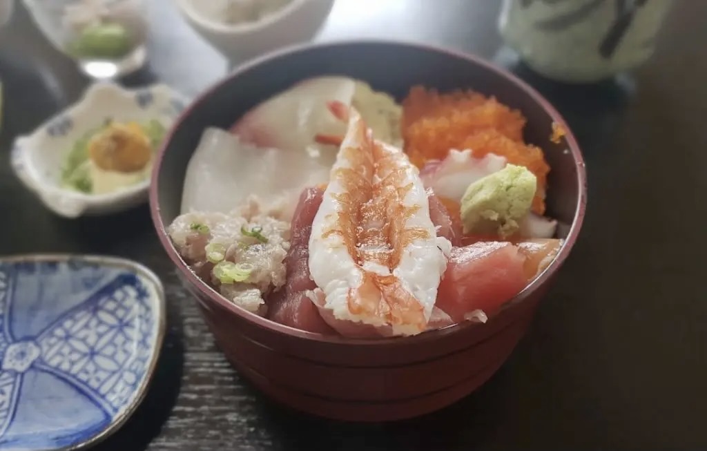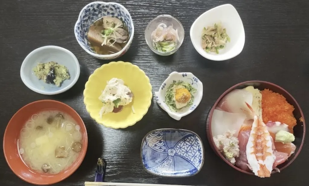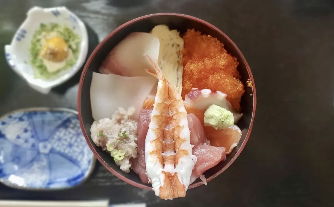 The service lunch includes a bowl of rice topped with seafood and a small bowl of Japanese home cooking.